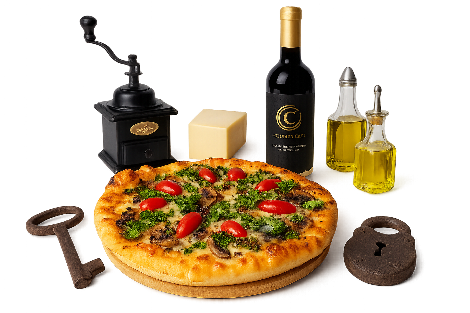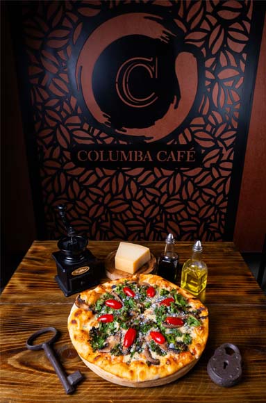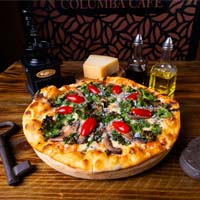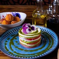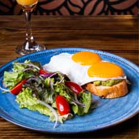Huevos estrellados, bañados con salsa pomodoro, queso mozarella y albahaca acompañados con pan de la casa.