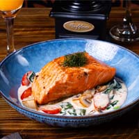 De claras de huevo relleno de espinaca, champiñón y fresco requesón acompañado con frijol refrito.